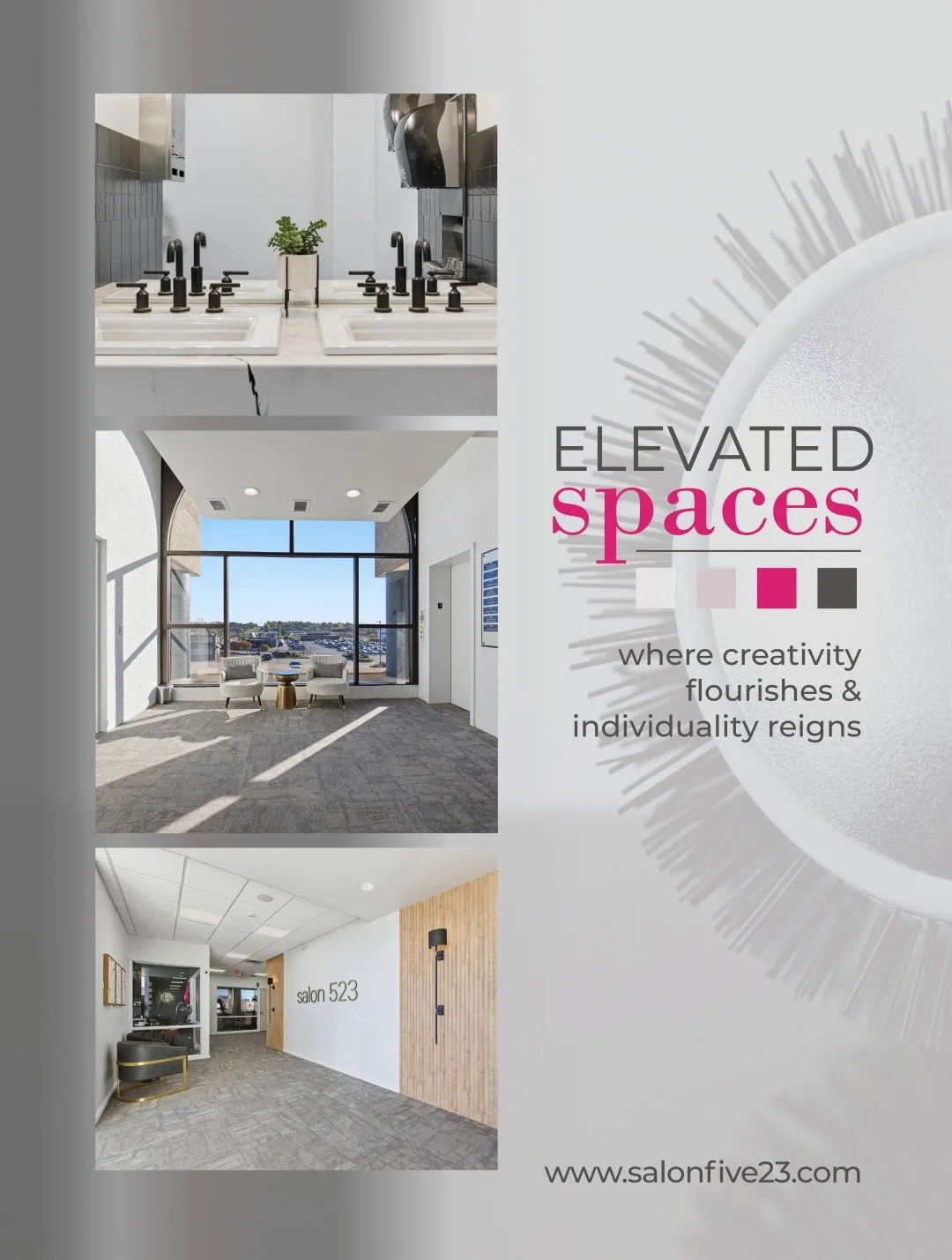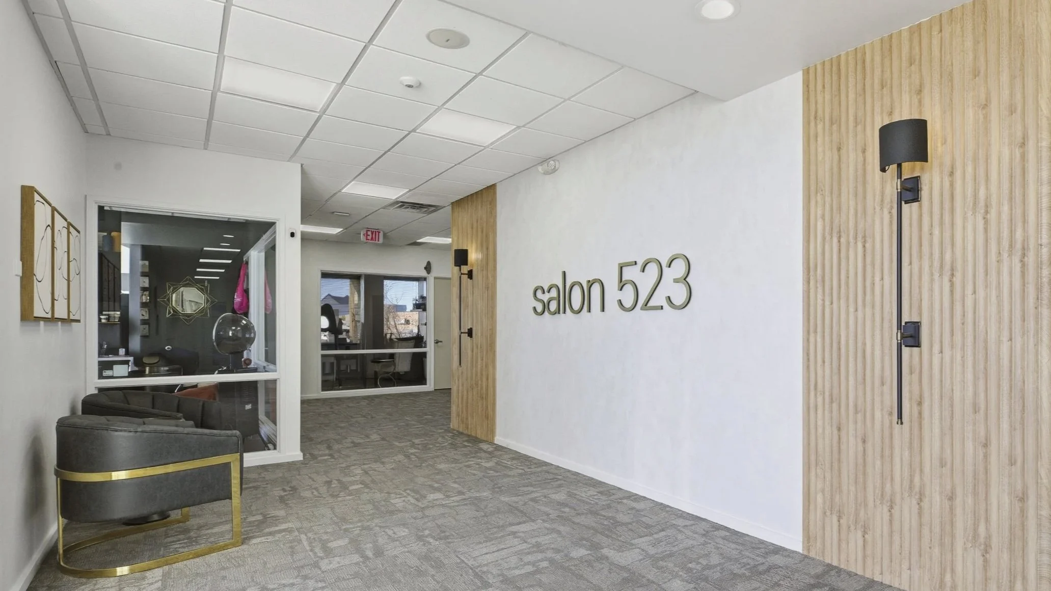 Salon 523 has 20 suites: 3 Exterior & 8 Interior Suites (17, singles, 2 doubles & 1 multi-suite space featuring 4 private rooms, an open retail/waiting area & large reception desk.